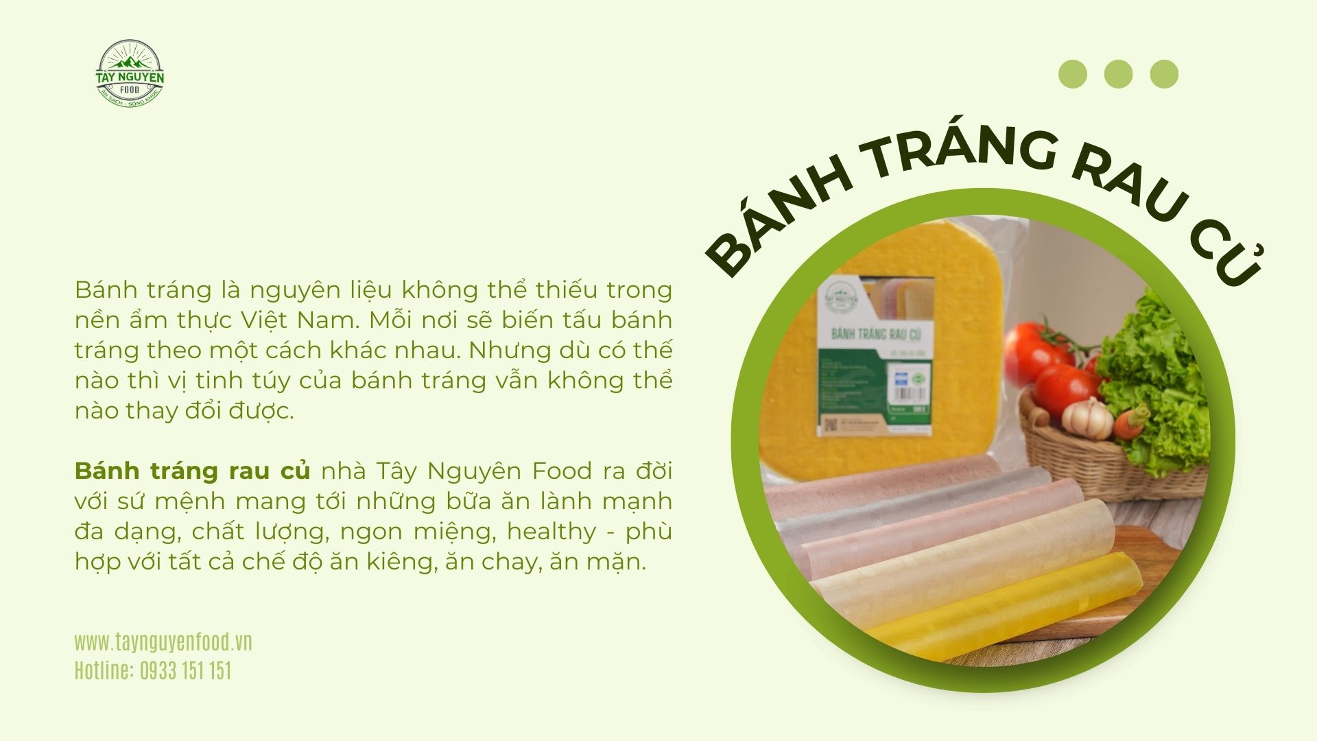 Bánh tráng rau củ nhà Tây Nguyên Food - Việt Nam ra đời với sứ mệnh mang tới những bữa ăn lành mạnh đa dạng, chất lượng, ngon miệng, healthy - phù hợp với tất cả chế độ ăn - ăn chay, ăn mặn.