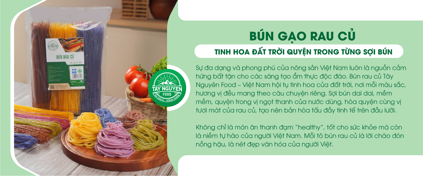 Sự đa dạng và phong phú của nông sản Việt Nam luôn là nguồn cảm hứng bất tận cho các sáng tạo ẩm thực độc đáo. Bún rau củ Tây Nguyên Food – Việt Nam hội tụ tinh hoa của đất trời, nơi mỗi màu sắc, hương vị đều mang theo câu chuyện riêng. Sợi bún dai dai, mềm mềm, quyện trong vị ngọt thanh của nước dùng, hòa quyện cùng vị tươi mát của rau củ, tạo nên bản hòa tấu đầy tinh tế trên đầu lưỡi.