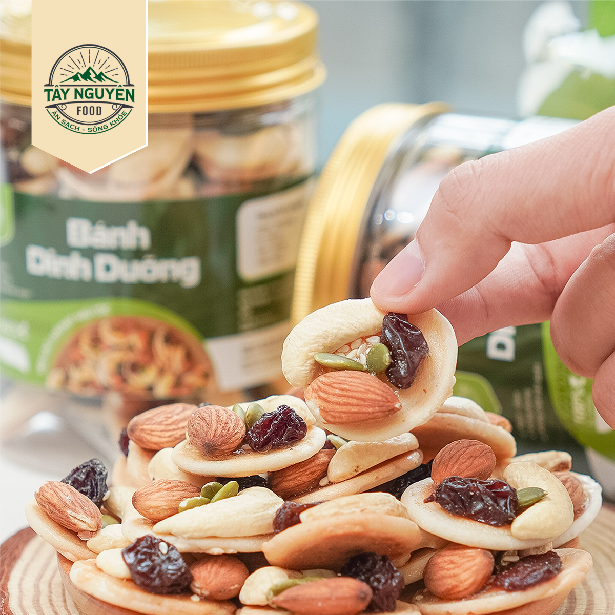 Nếu bạn muốn tìm một lựa chọn thay thế cho bánh gạo truyền thống, bánh dinh dưỡng của Tây Nguyên Food - Việt Nam là một sự lựa chọn hoàn hảo. Được làm thủ công từ hỗn hợp các loại hạt như hạnh nhân, bí xanh, nho Chile, điều rang nguyên vị và vừng trắng, bánh dinh dưỡng mang đến cho bạn nguồn dinh dưỡng phong phú, bánh có vị ngọt dịu nhẹ, hoàn toàn không cần sử dụng đường tinh luyện. Bên cạnh đó, bánh dinh dưỡng còn có độ giòn tan đặc trưng từ các loại hạt, mang lại trải nghiệm ăn vặt thú vị. Với hàm lượng chất béo tốt, chất xơ, protein và các chất dinh dưỡng quan trọng, bánh dinh dưỡng không chỉ ngon miệng mà còn có lợi cho sức khỏe.