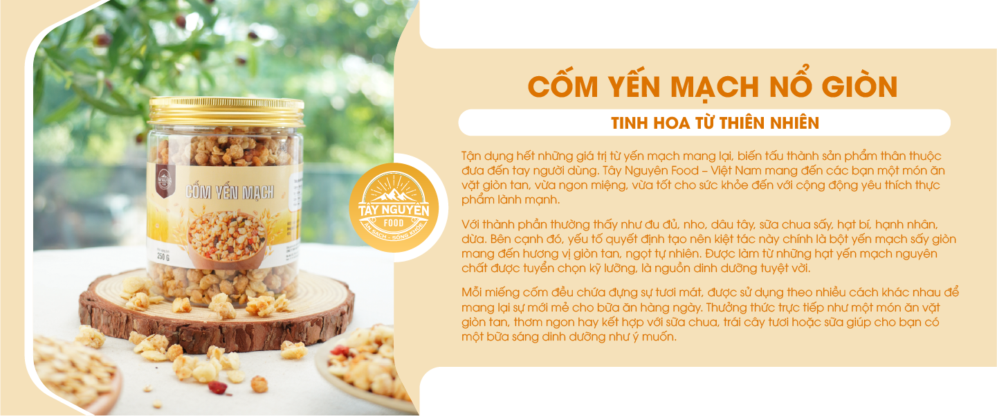 Tận dụng hết những giá trị từ yến mạch mang lại, biến tấu thành sản phẩm thân thuộc đưa đến tay người dùng. Tây Nguyên Food – Việt Nam mang đến các bạn một món ăn vặt giòn tan, vừa ngon miệng, vừa tốt cho sức khỏe đến với cộng động yêu thích thực phẩm lành mạnh.