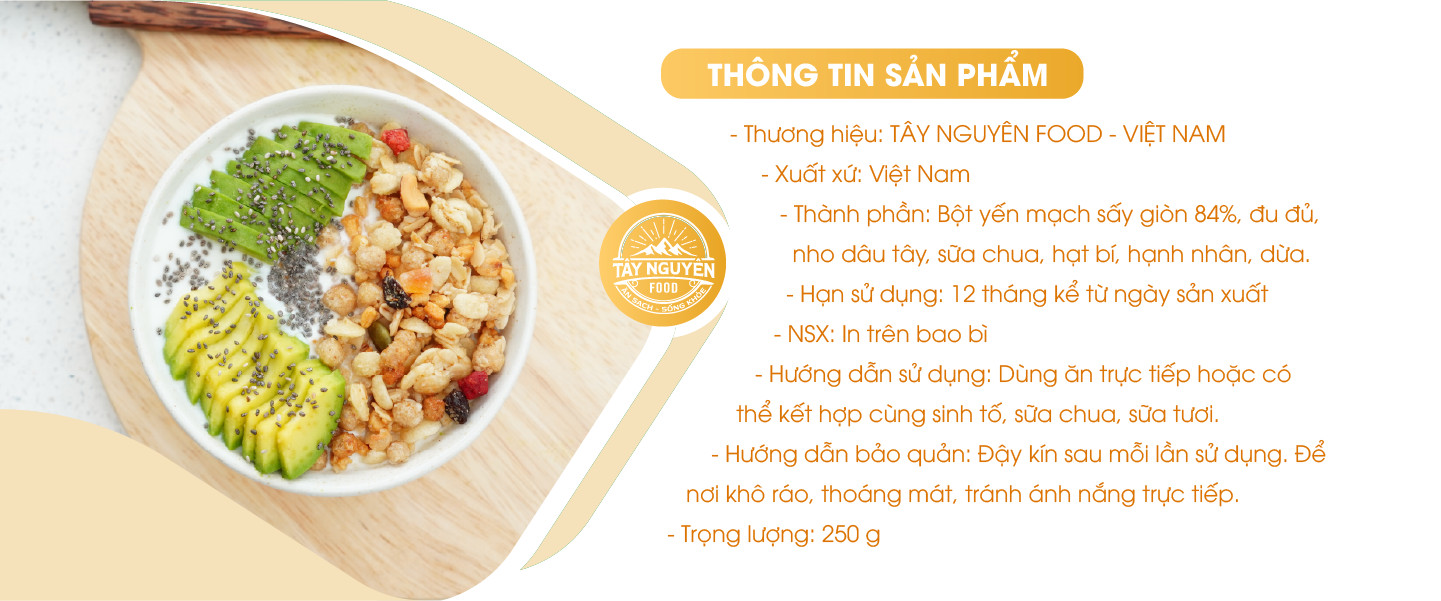 Với thành phần thường thấy như đu đủ, nho, dâu tây, sữa chua sấy, hạt bí, hạnh nhân, dừa. Bên cạnh đó, yếu tố quyết định tạo nên kiệt tác này chính là bột yến mạch sấy giòn mang đến hương vị giòn tan, ngọt tự nhiên. Được làm từ những hạt yến mạch nguyên chất được tuyển chọn kỹ lưỡng, là nguồn dinh dưỡng tuyệt vời.