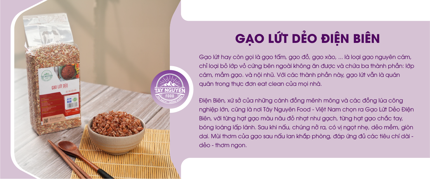 Điện Biên, xứ sở của những cánh đồng mênh mông và các đồng lúa công nghiệp lớn, cũng là nơi Tây Nguyên Food - Việt Nam chọn ra Gạo Lứt Dẻo Điện Biên, với từng hạt gạo màu nâu đỏ nhạt như gạch, từng hạt gạo chắc tay, bóng loáng lấp lánh. Sau khi nấu, chúng nở ra, có vị ngọt nhẹ, dẻo mềm, giòn dai. Mùi thơm của gạo sau nấu lan khắp phòng, đáp ứng đủ các tiêu chí dài - dẻo - thơm ngon.