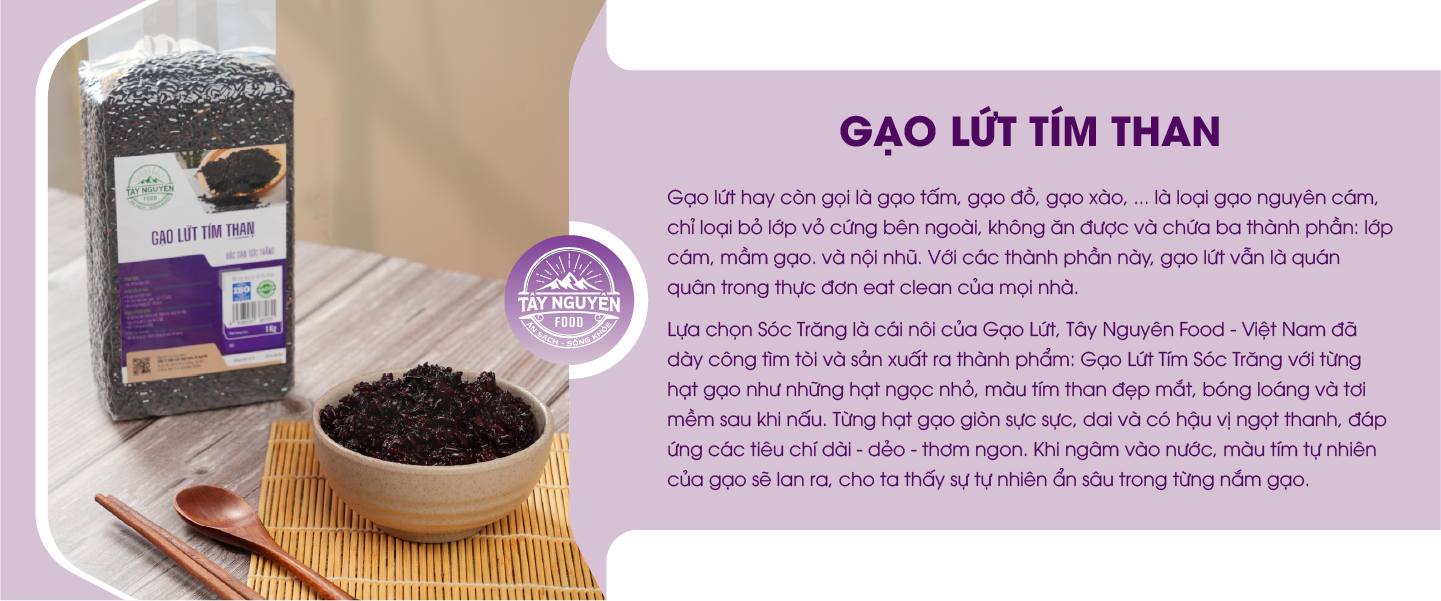 Lựa chọn Sóc Trăng là cái nôi của Gạo Lứt, Tây Nguyên Food - Việt Nam đã dày công tìm tòi và sản xuất ra thành phẩm: Gạo Lứt Tím Sóc Trăng với từng hạt gạo như những hạt ngọc nhỏ, màu tím than đẹp mắt, bóng loáng và tơi mềm sau khi nấu. Từng hạt gạo giòn sực sực, dai và có hậu vị ngọt thanh, đáp ứng các tiêu chí dài - dẻo - thơm ngon. Khi ngâm vào nước, màu tím tự nhiên của gạo sẽ lan ra, cho ta thấy sự tự nhiên ẩn sâu trong từng nắm gạo.