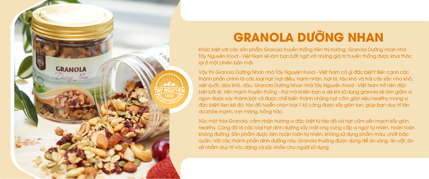 Vậy thì Granola Dưỡng Nhan nhà Tây Nguyên Food - Việt Nam có gì đặc biệt? Bên cạnh các thành phần chính là các loại hạt: hạt điều, hạnh nhân, hạt bí, táo khô và trái cây sấy: nho khô, việt quất, dừa khô, dâu. Granola Dưỡng Nhan nhà Tây Nguyên Food - Việt Nam trở nên đặc biệt lởi lẽ: Yến mạch truyền thống - thứ mà khiến bạn e dè khi sử dụng granola sẽ làm giảm vị ngon sẽ được xay thành bột và được chế biến thành những hạt cốm giòn siêu heathy mang vị đặc biệt! Xen kẽ đó, táo đỏ tuyển chọn loại 1 kĩ càng được sấy giòn tan, giúp bạn trì làn da khỏe mạnh, mịn màng, hồng hào.