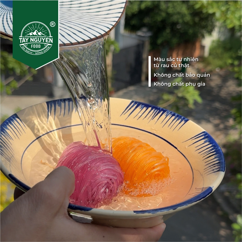 Được lấy cảm hứng từ một trong những sản phẩm “heathy” bán chạy nhất của Tây Nguyên Food Việt Nam - mì Chũ rau củ, hủ tiếu rau củ được làm từ gạo tinh bột gạo nguyên chất, tinh bột khoai mì cùng màu sắc tự nhiên từ rau củ tạo nên một kết cấu dai mềm, đượm hương thơm mộc mạc của sợi hủ tiếu truyến thống. Kết hợp hủ tiếu rau củ nấu cùng nước hầm xương nhiều giờ, mang đến tô hủ tiếu “healthy” thơm ngon, đậm vị.