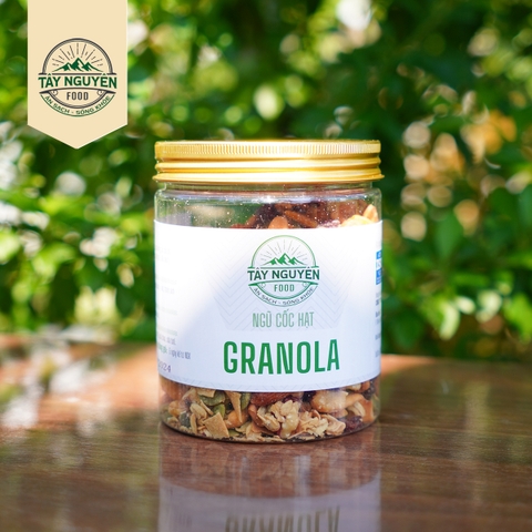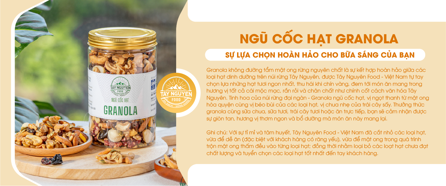 Granola không đường tẩm mật ong rừng nguyên chất là sự kết hợp hoàn hảo giữa các loại hạt dinh dưỡng trên núi rừng Tây Nguyên, được Tây Nguyên Food - Việt Nam tự tay chọn lựa những hạt tươi ngon nhất, thu hái khi chín vàng, đem tới món ăn mang trong hương vị tất cả cái mộc mạc, rắn rỏi và chân chất như chính cốt cách văn hóa Tây Nguyên. Tinh hoa của núi rừng đại ngàn - Granola ngũ cốc hạt, vị ngọt thanh từ mật ong hòa quyện cùng vị béo bùi của các loại hạt, vị chua nhẹ của trái cây sấy. Thưởng thức granola cùng sữa chua, sữa tươi, trái cây tươi hoặc ăn trực tiếp, bạn sẽ cảm nhận được sự giòn tan, hương vị thơm ngon và bổ dưỡng mà món ăn này mang lại.