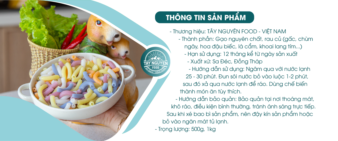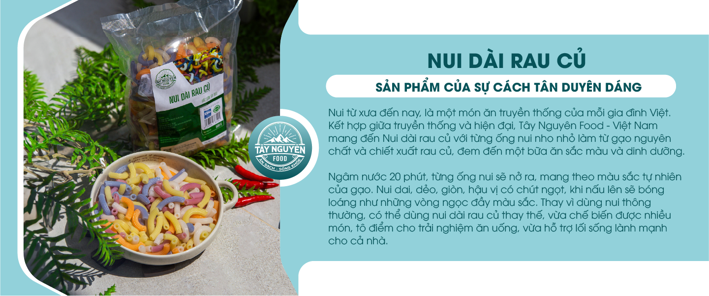Nui từ xưa đến nay, là một món ăn truyền thống của mỗi gia đình Việt. Kết hợp giữa truyền thống và hiện đại, Tây Nguyên Food – Việt Nam mang đến Nui dài rau củ với từng ống nui nho nhỏ làm từ gạo nguyên chất và chiết xuất rau củ, đem đến một bữa ăn sắc màu và dinh dưỡng.